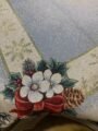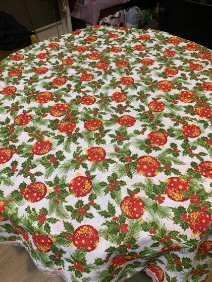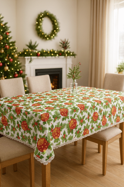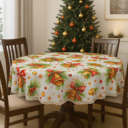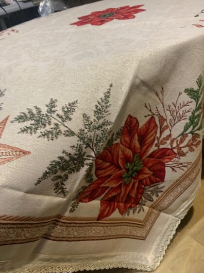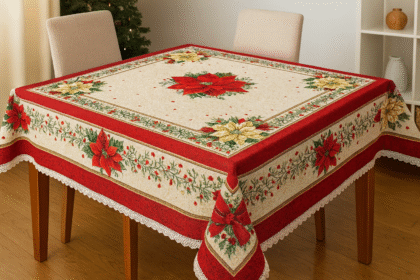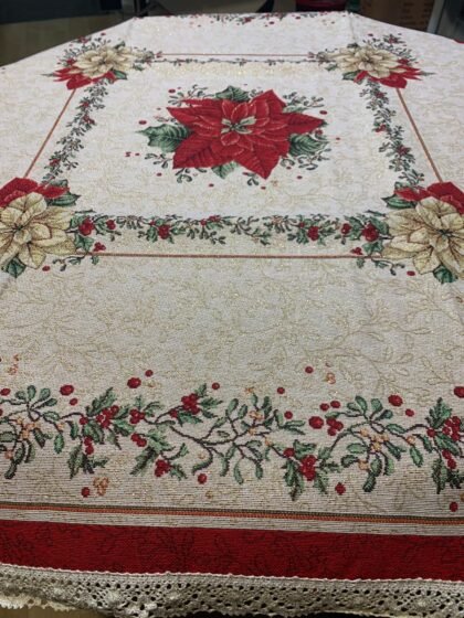 O față de masă care arată ca o ilustrație de iarnă: căsuțe cu lumină caldă, brazi încărcați de zăpadă, sanie trasă de cal și detalii de poveste. Modelul este încadrat de o bordură elegantă cu fulgi aurii și colțuri cu crăciuniță (poinsettia), fundă roșie, con de brad și frunze de ilex, iar țesătura are un sclipici discret care prinde frumos lumina în serile festive.