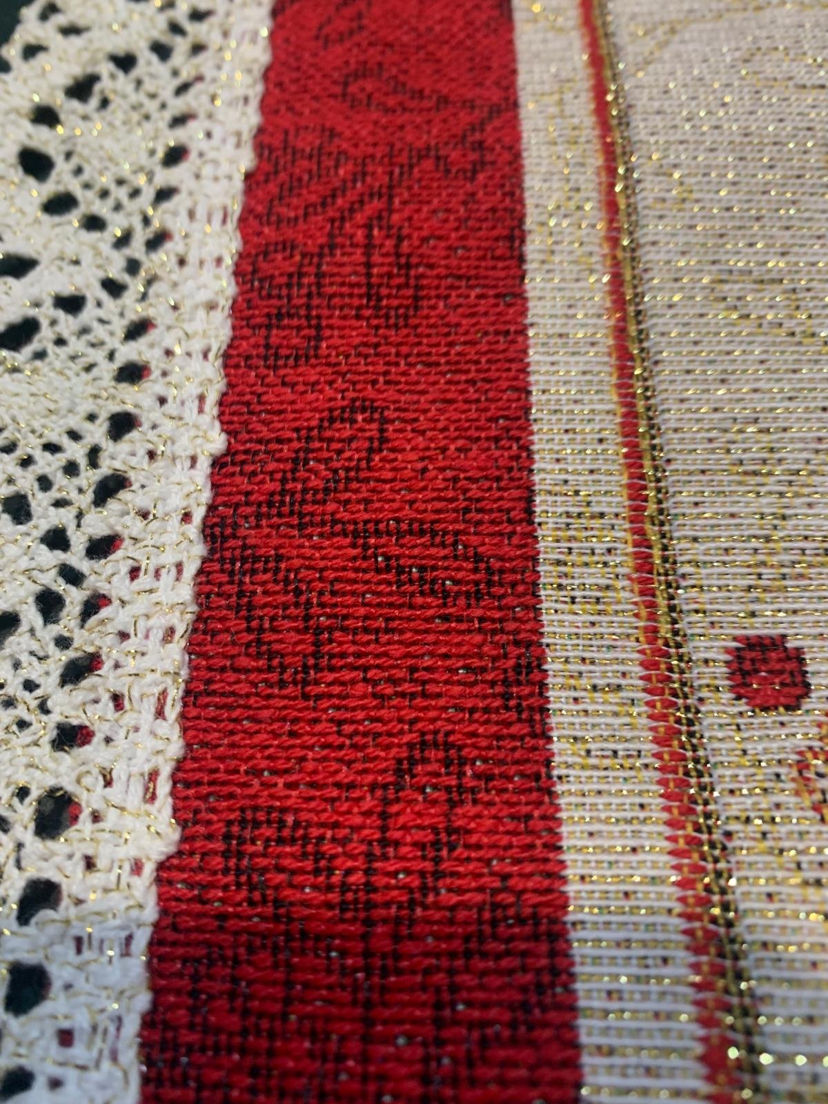 Napronul care “face ordine” în decor: îl pui și masa arată instant pregătită de sărbătoare. Modelul cu fundă roșie și elemente festive, plus țesătura cu reflexii aurii, îl fac perfect pentru un decor cald și elegant. Merge atât pe mese mari (ca accent), cât și pe mobilă (comodă, bufet, consolă).