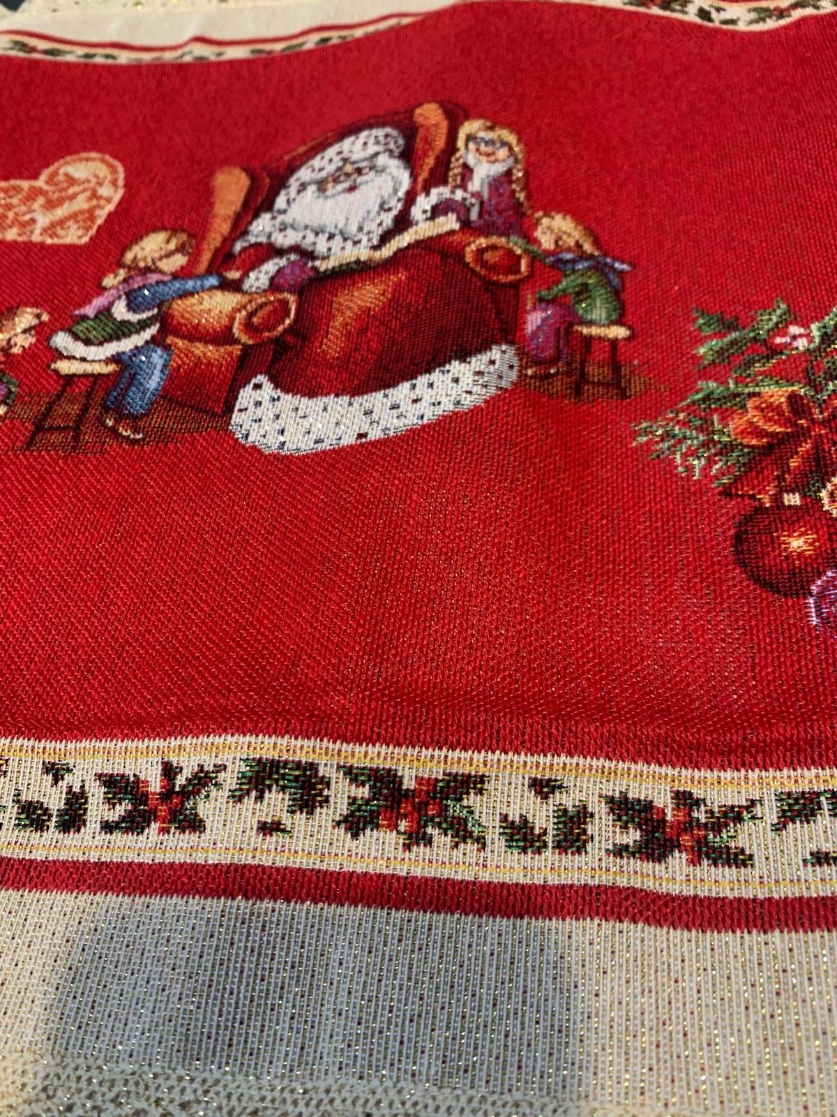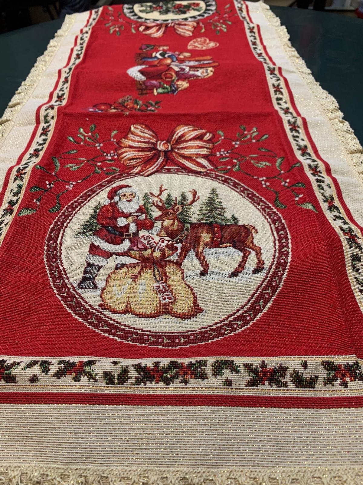Adaugă instant un aer de sărbătoare mesei tale cu acest napron de Crăciun 100×50 cm, realizat din țesătură tip goblen/jacquard, cu un efect discret de sclipire în lumină. Designul festiv, în tonuri calde (roșu, crem și accente aurii), transformă orice masă într-un colț elegant de iarnă – perfect pentru cinele de Crăciun, întâlnirile cu familia sau decorul de sezon.